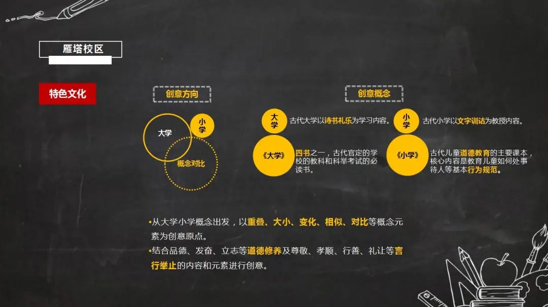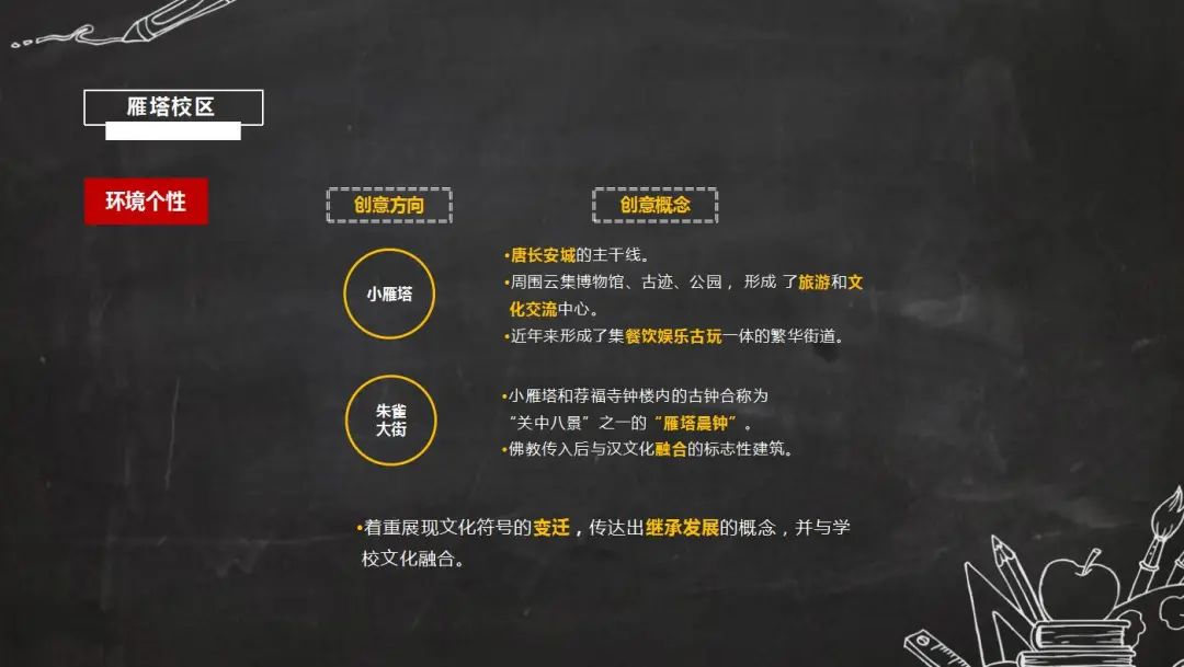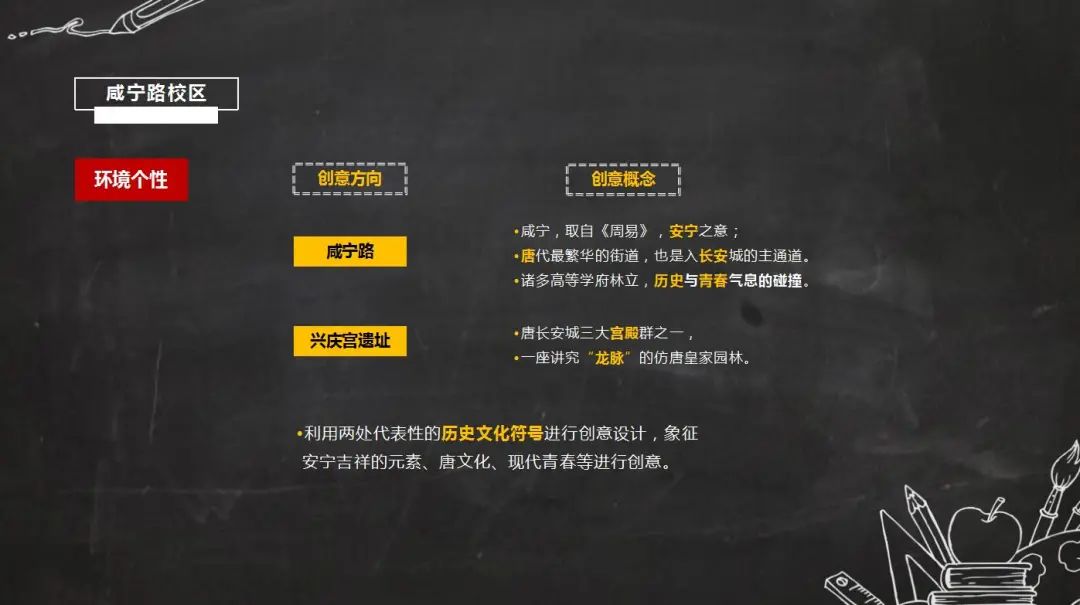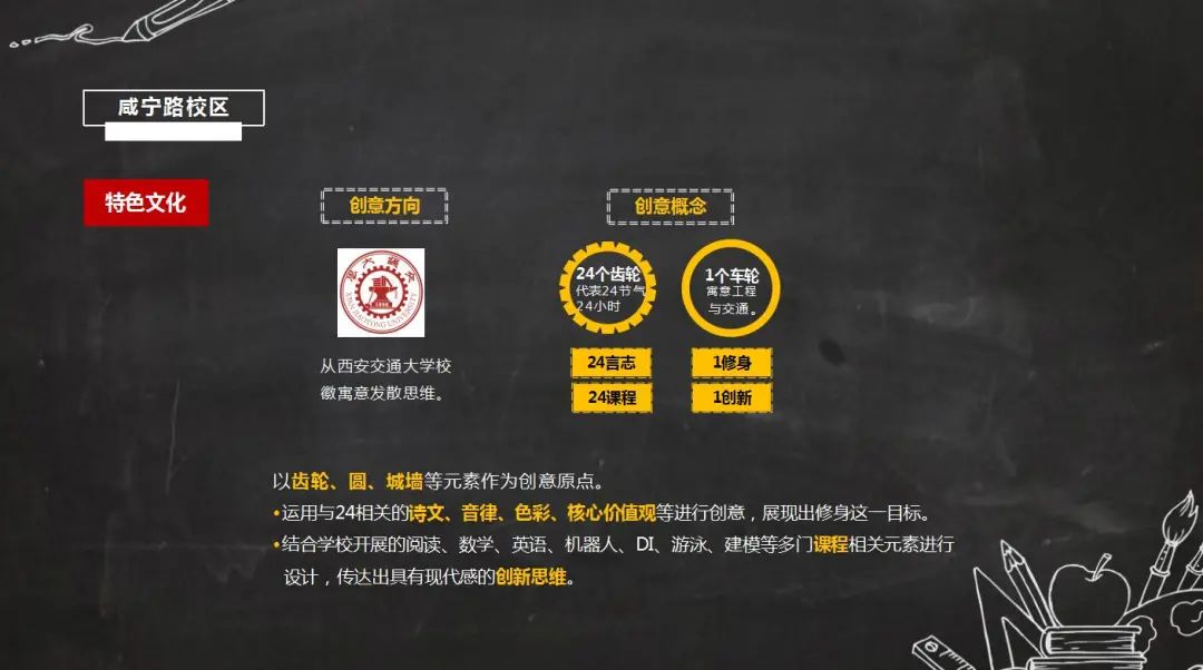 結(jié)合西安交通大學(xué)附屬小學(xué)各校區(qū),分別從特色文化及環(huán)境個(gè)性方面思考出創(chuàng)意方向。