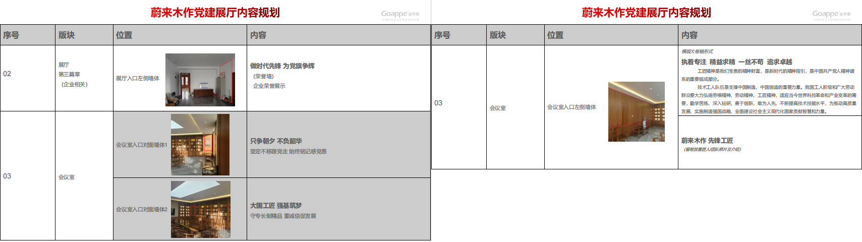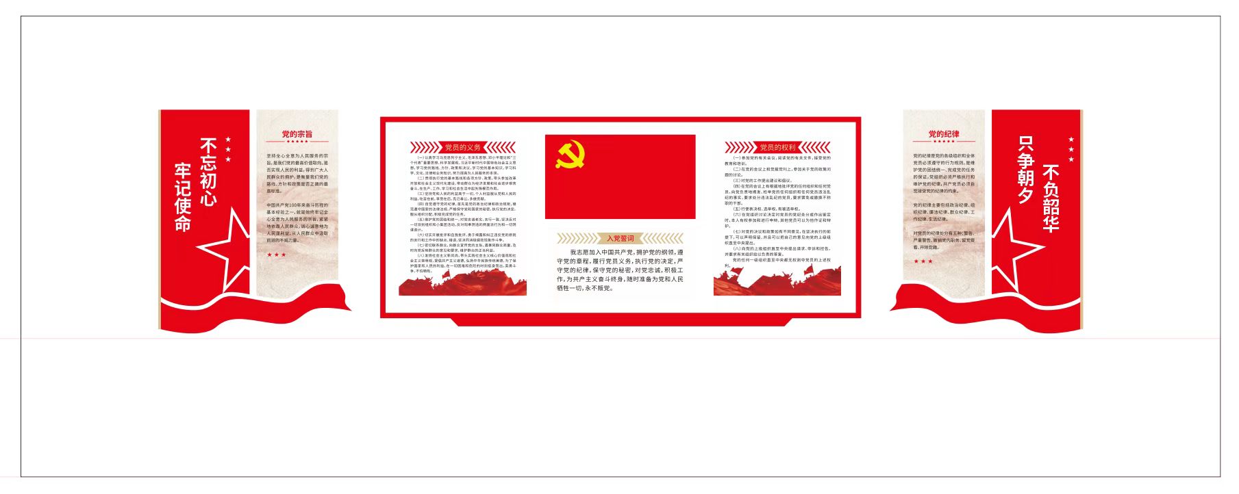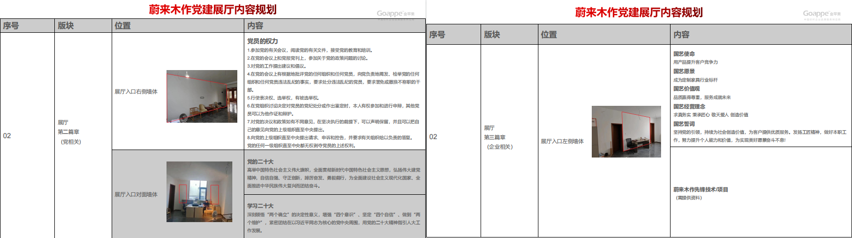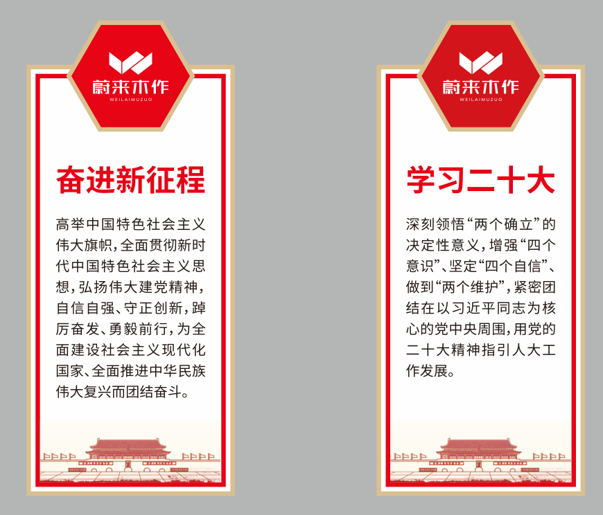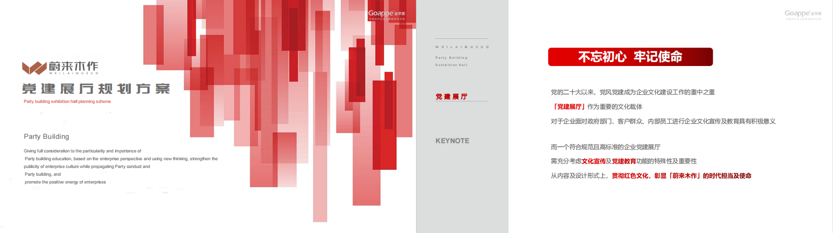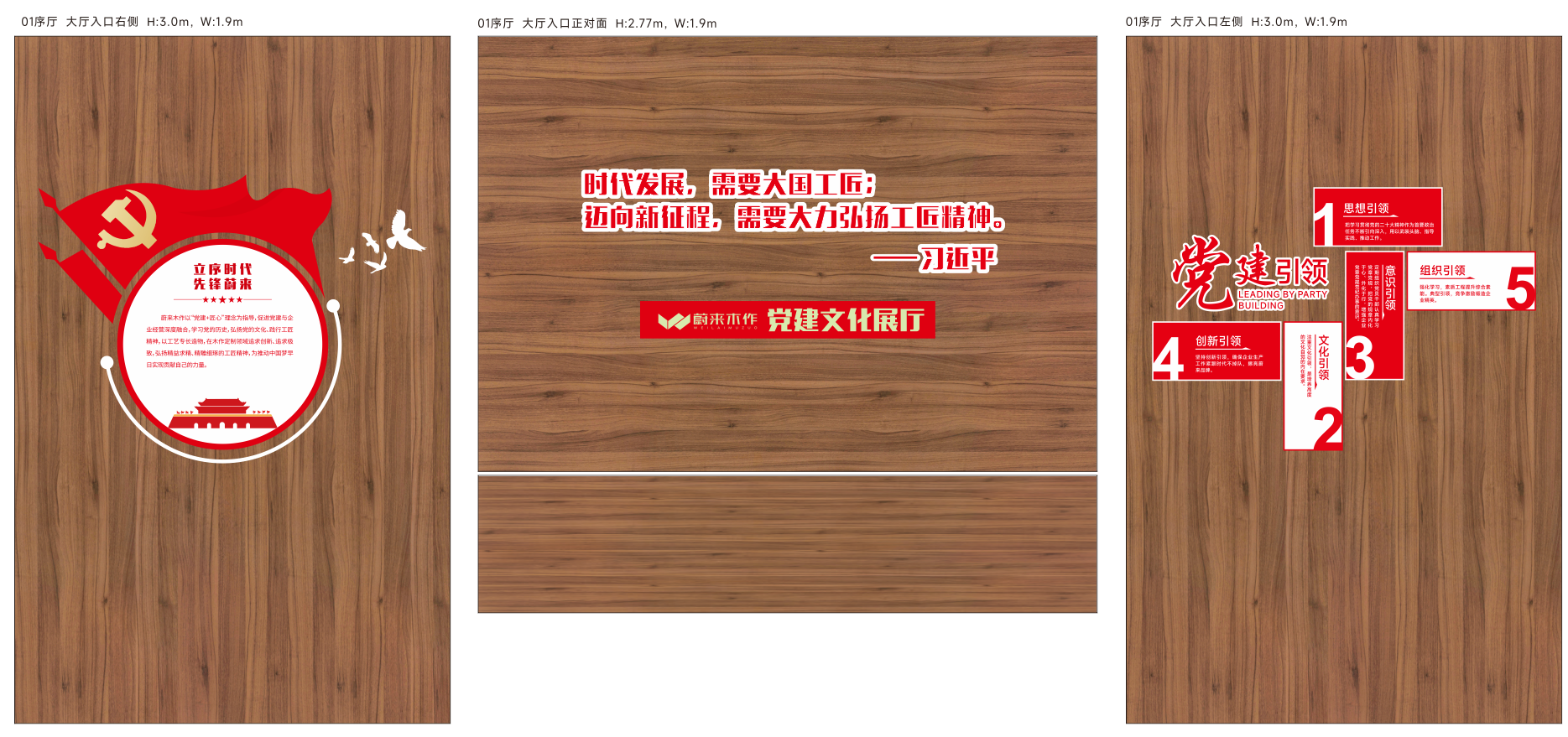 內(nèi)容與邏輯,是黨建展廳的文字表達形式,而畫面組合設(shè)計,則是展廳最直觀的視覺表達方式。在「蔚來木作」黨建展廳的設(shè)計考量上,除一般黨建展廳會綜合運用的“黨徽”、“黨旗”、“紅綢”等設(shè)計元素的比例尺寸等,“紅色”及“金色”主色調(diào)及輔色的搭配等,還需因地制宜,對于「蔚來木作」“黨建大廳”和“黨建會議室”特殊的木質(zhì)墻體與空間形態(tài),需更加細致的考究設(shè)計版面的配色及造型,使其不脫離黨建展廳的紅色主基調(diào),又有不脫離空間場景的美感,由此實現(xiàn)設(shè)計效果的最優(yōu)化。