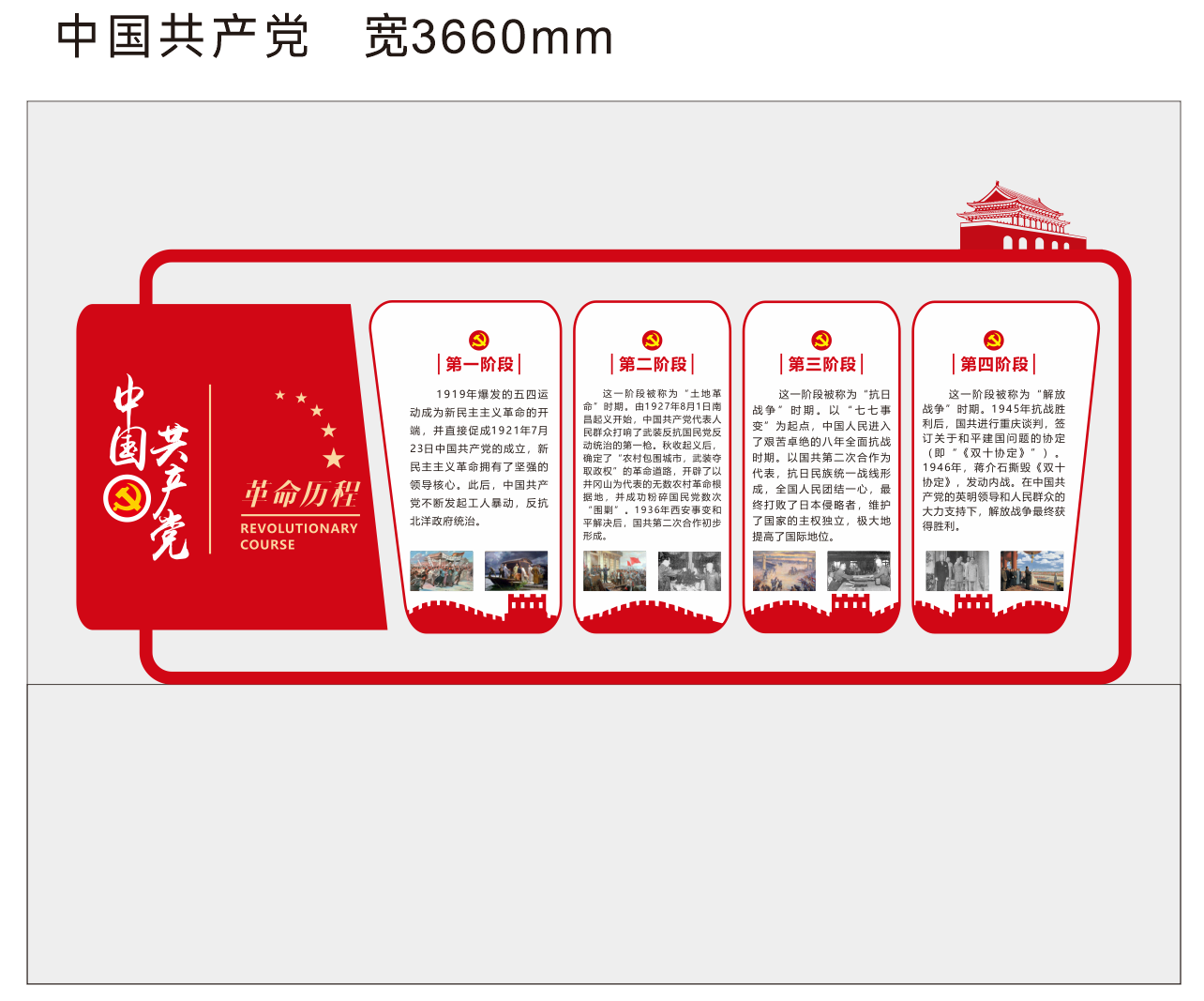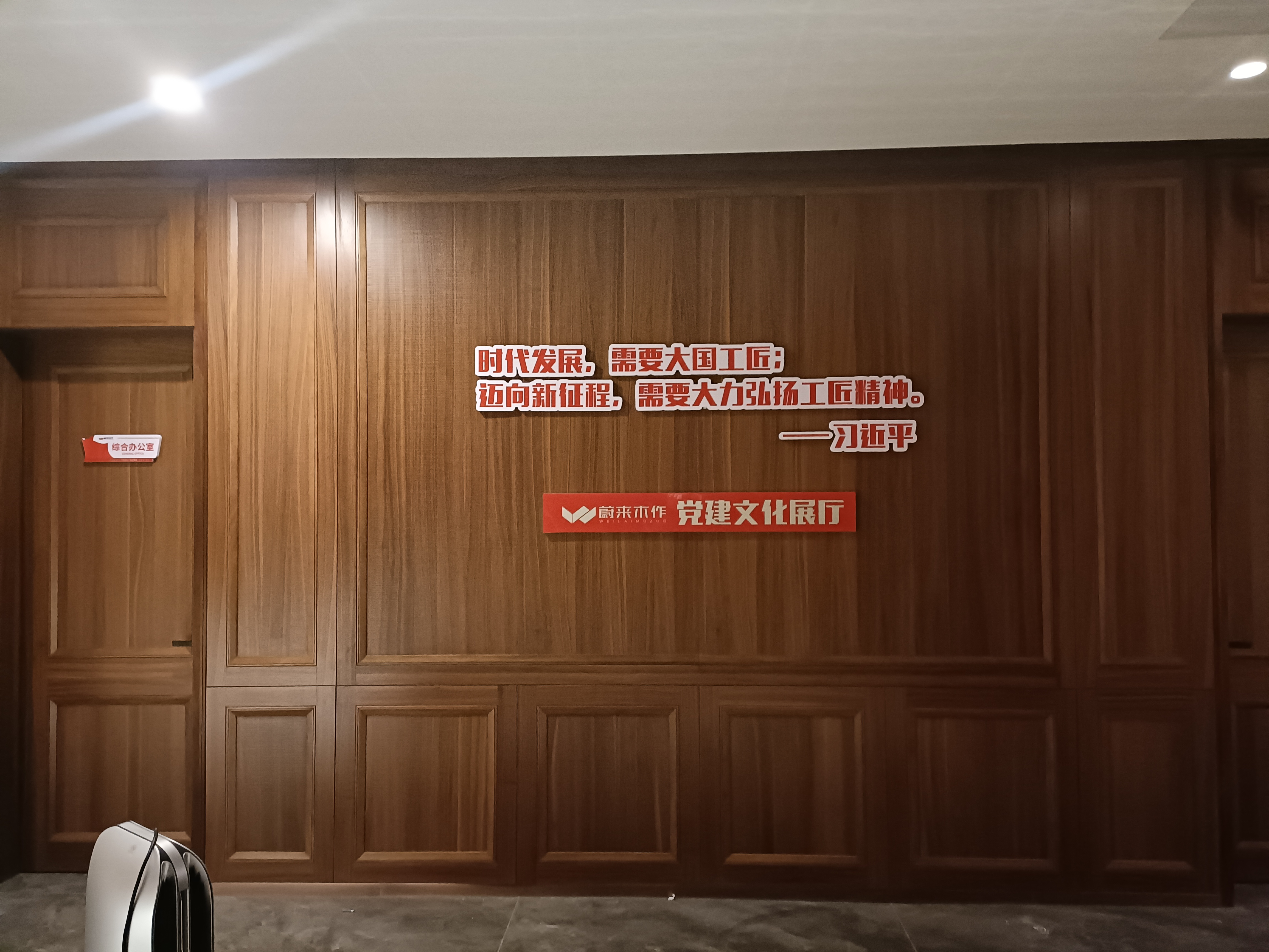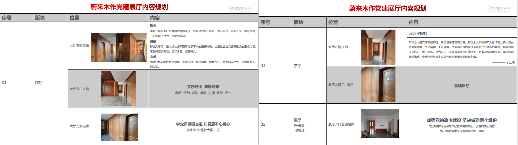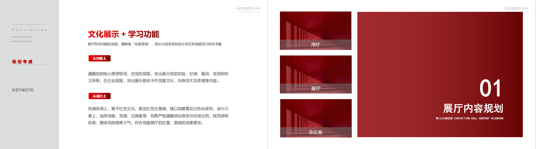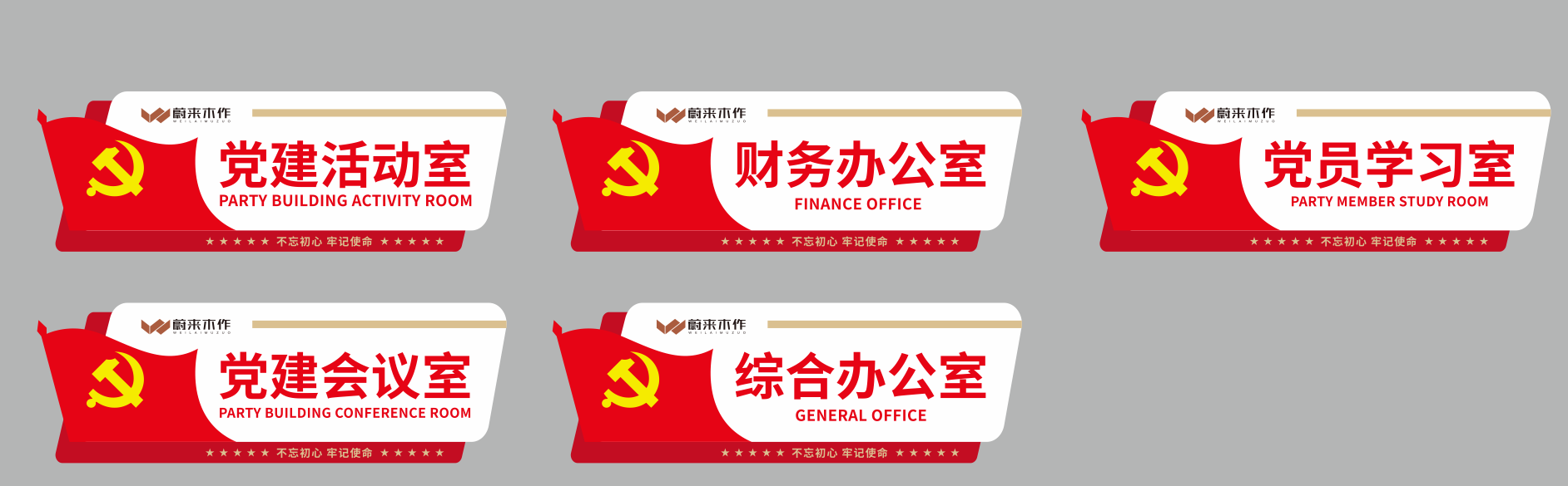 內(nèi)容與邏輯,是黨建展廳的文字表達形式,而畫面組合設(shè)計,則是展廳最直觀的視覺表達方式。在「蔚來木作」黨建展廳的設(shè)計考量上,除一般黨建展廳會綜合運用的“黨徽”、“黨旗”、“紅綢”等設(shè)計元素的比例尺寸等,“紅色”及“金色”主色調(diào)及輔色的搭配等,還需因地制宜,對于「蔚來木作」“黨建大廳”和“黨建會議室”特殊的木質(zhì)墻體與空間形態(tài),需更加細致的考究設(shè)計版面的配色及造型,使其不脫離黨建展廳的紅色主基調(diào),又有不脫離空間場景的美感,由此實現(xiàn)設(shè)計效果的最優(yōu)化。
