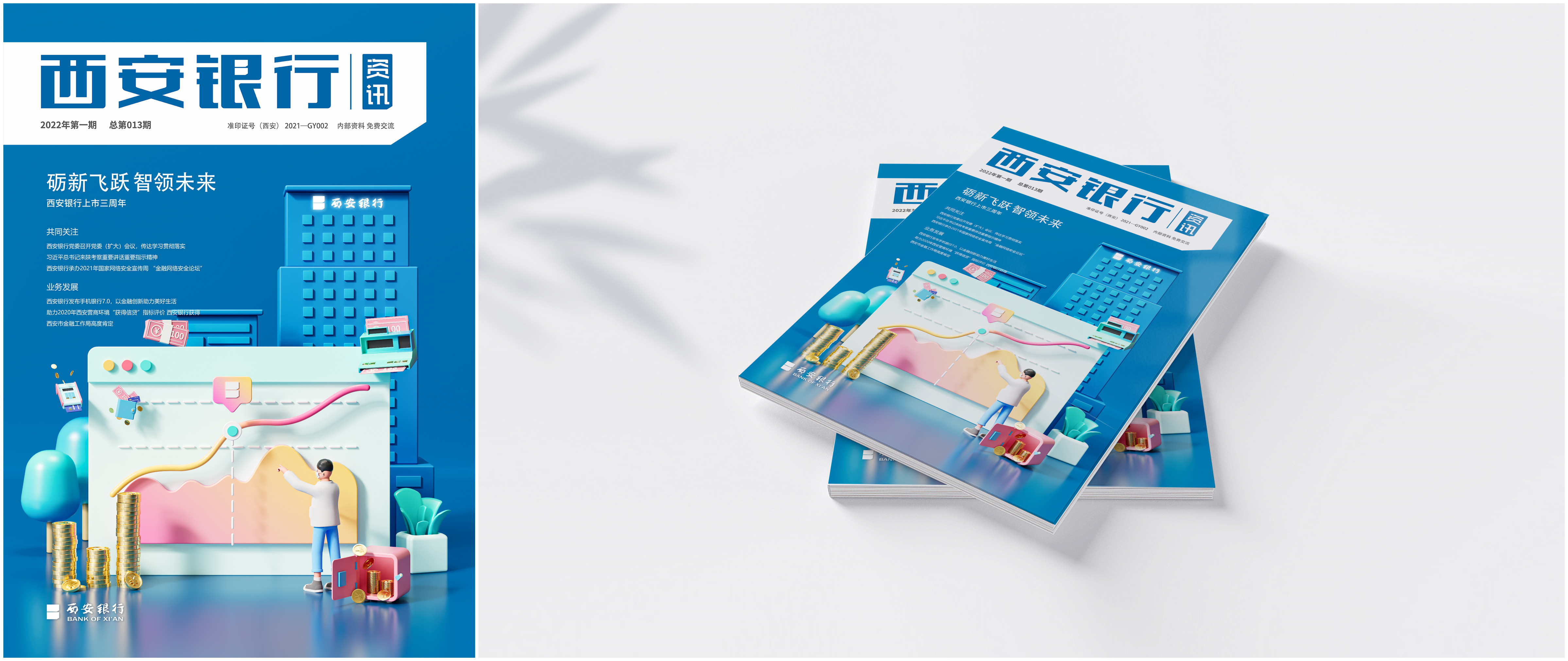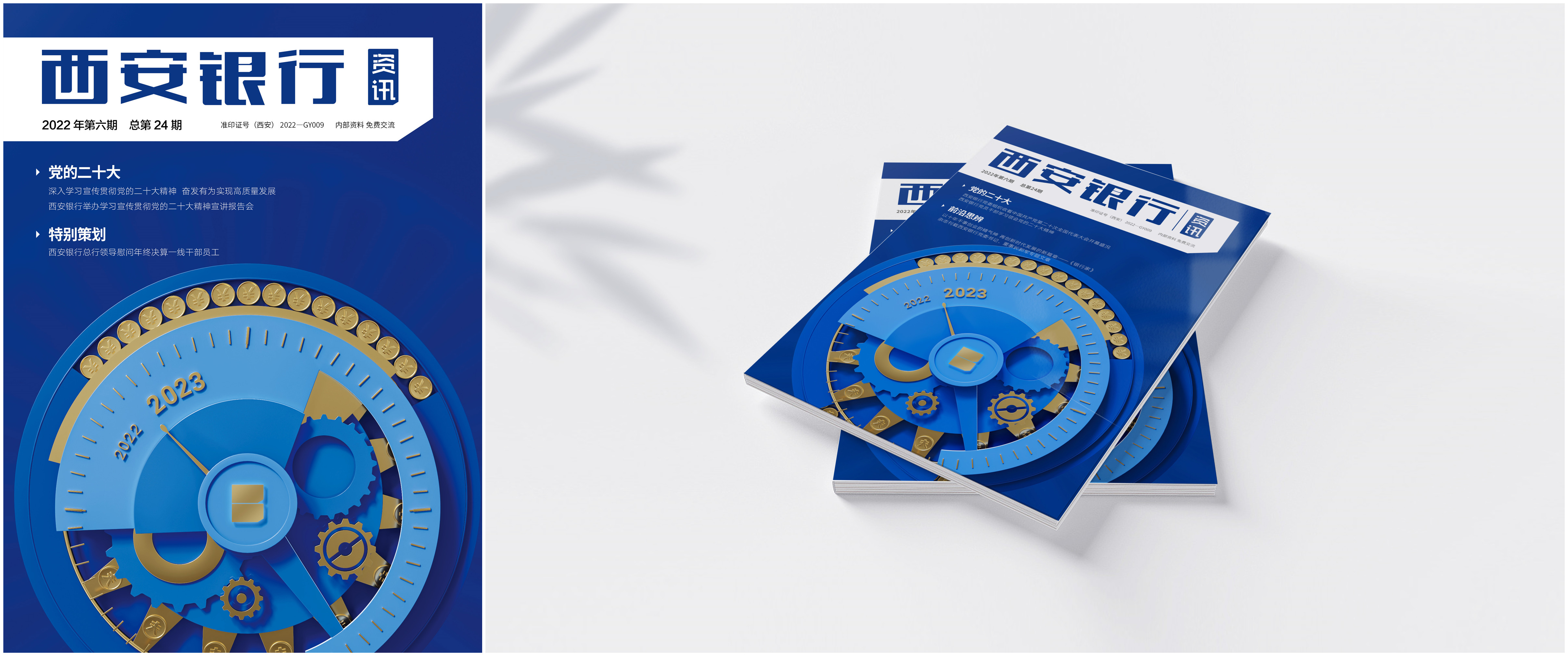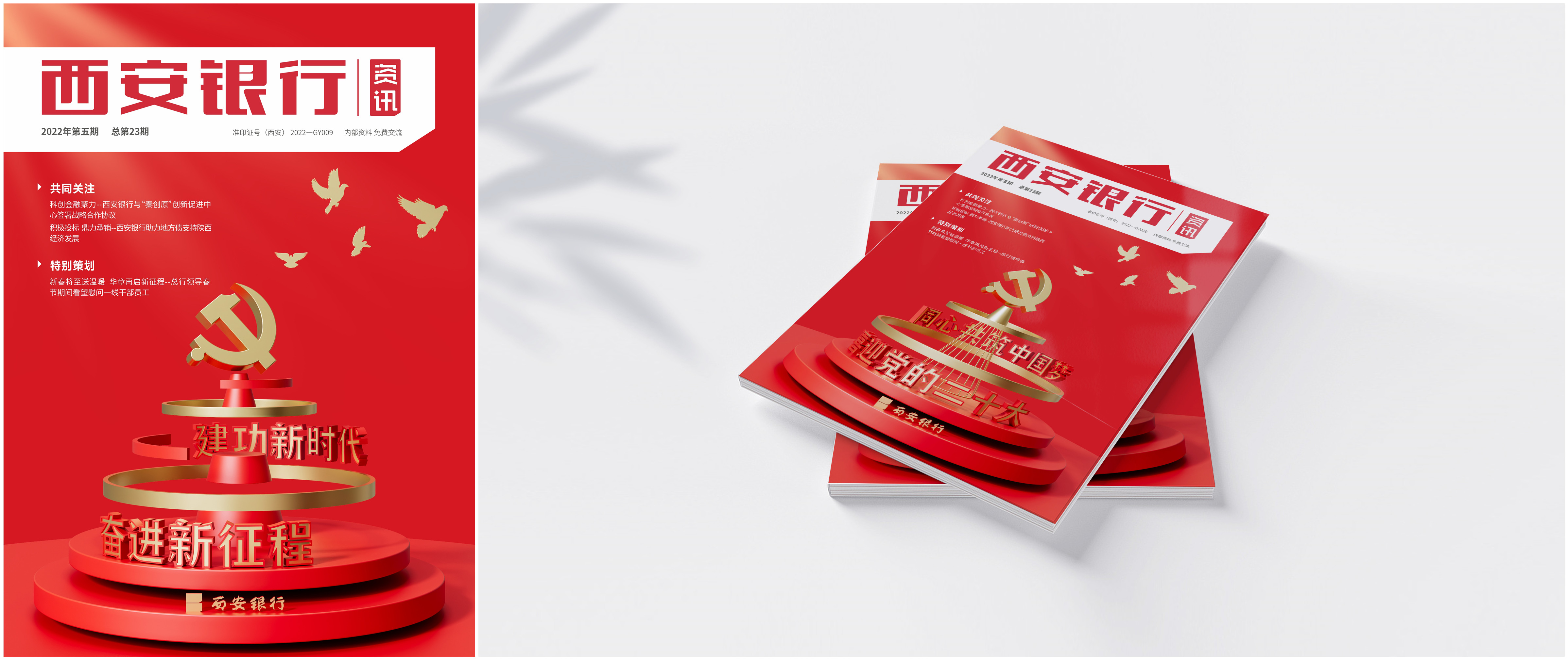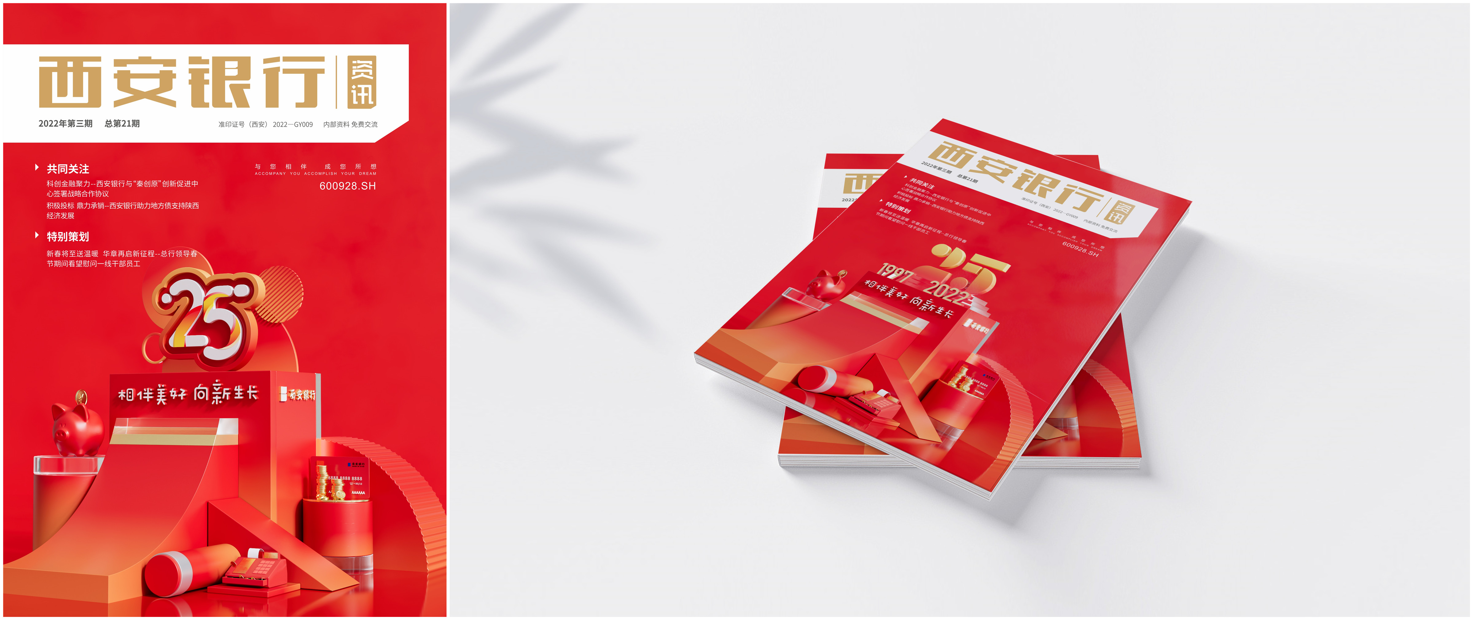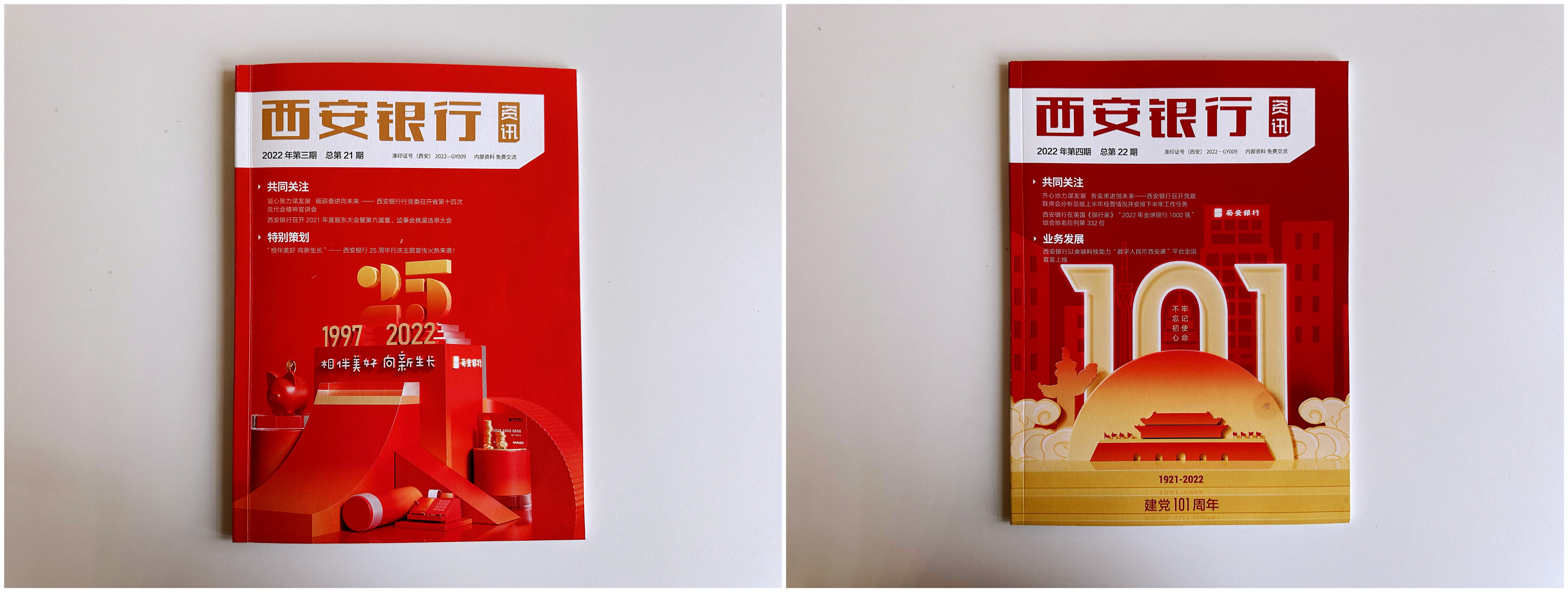 2022年《西安銀行》的封面設(shè)計,金蘋果團隊更是打破傳統(tǒng)設(shè)計手法,每期均根據(jù)不同的主題內(nèi)容進行針對性原創(chuàng)設(shè)計,以“三維建模及場景搭建”的全新設(shè)計筆觸,打造更加有質(zhì)感與亮眼的視覺效果。同時值得一提的是,2022年第三、四、五期期刊恰逢建黨節(jié)、西安銀行25周年及黨的二十大期間,特殊節(jié)點對封面色彩的應(yīng)用提出了更具象化的要求,“紅色”基本成為了核心色調(diào),但色彩的框定并未局限設(shè)計的廣度,多維設(shè)計形式與時事結(jié)合,“似而不同”的設(shè)計效果反而更容易激發(fā)讀者的大腦活性區(qū)域,由此也大幅提升了閱覽的期待值與積極性!