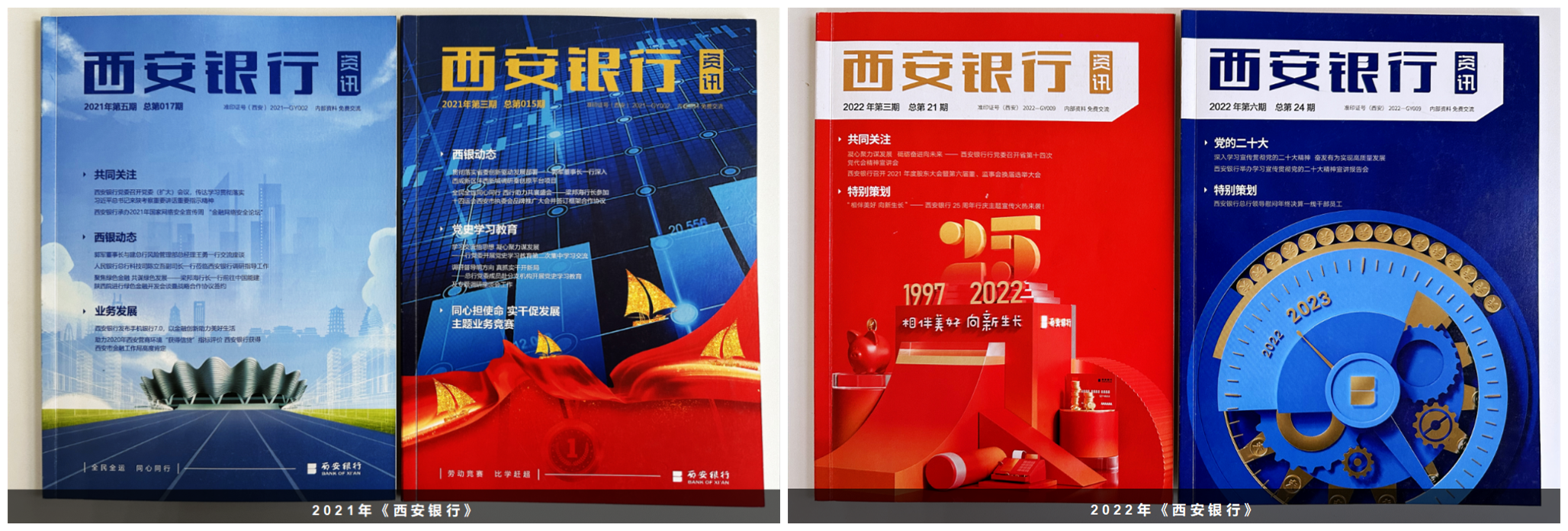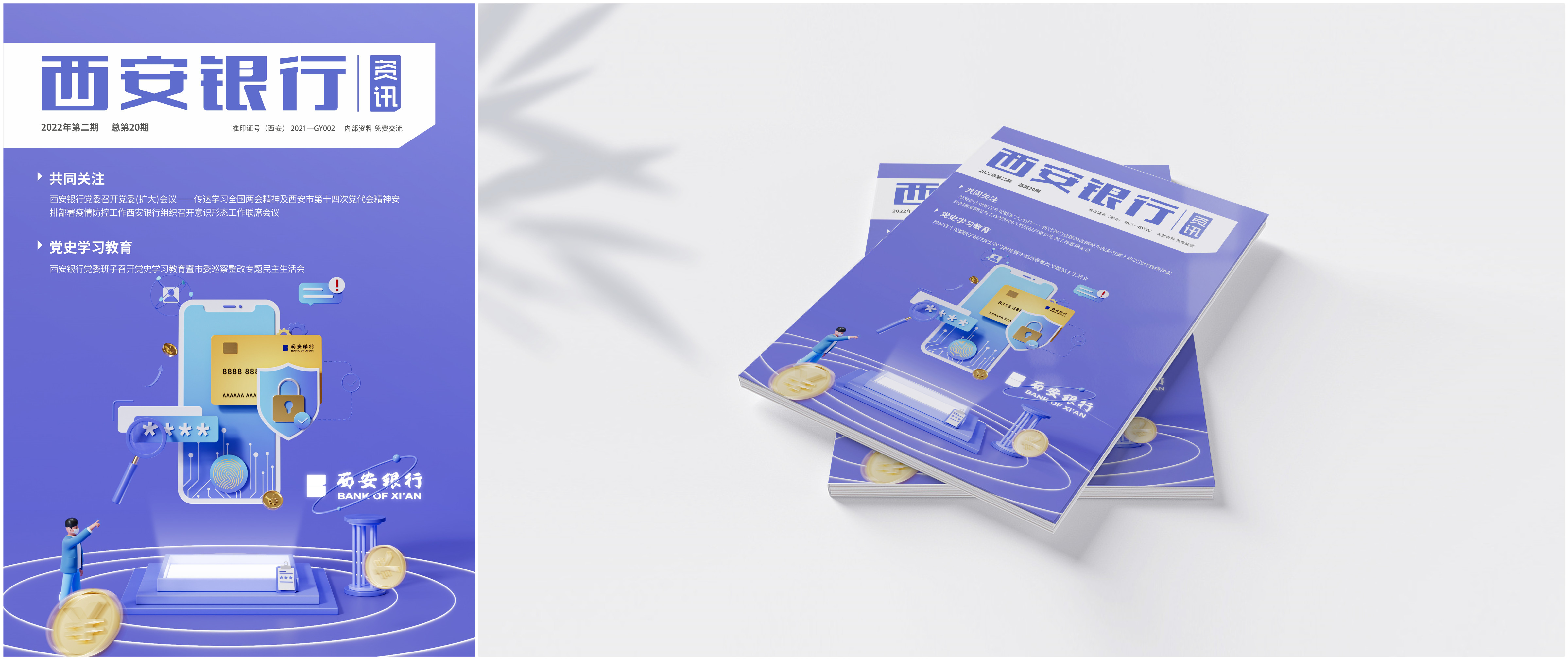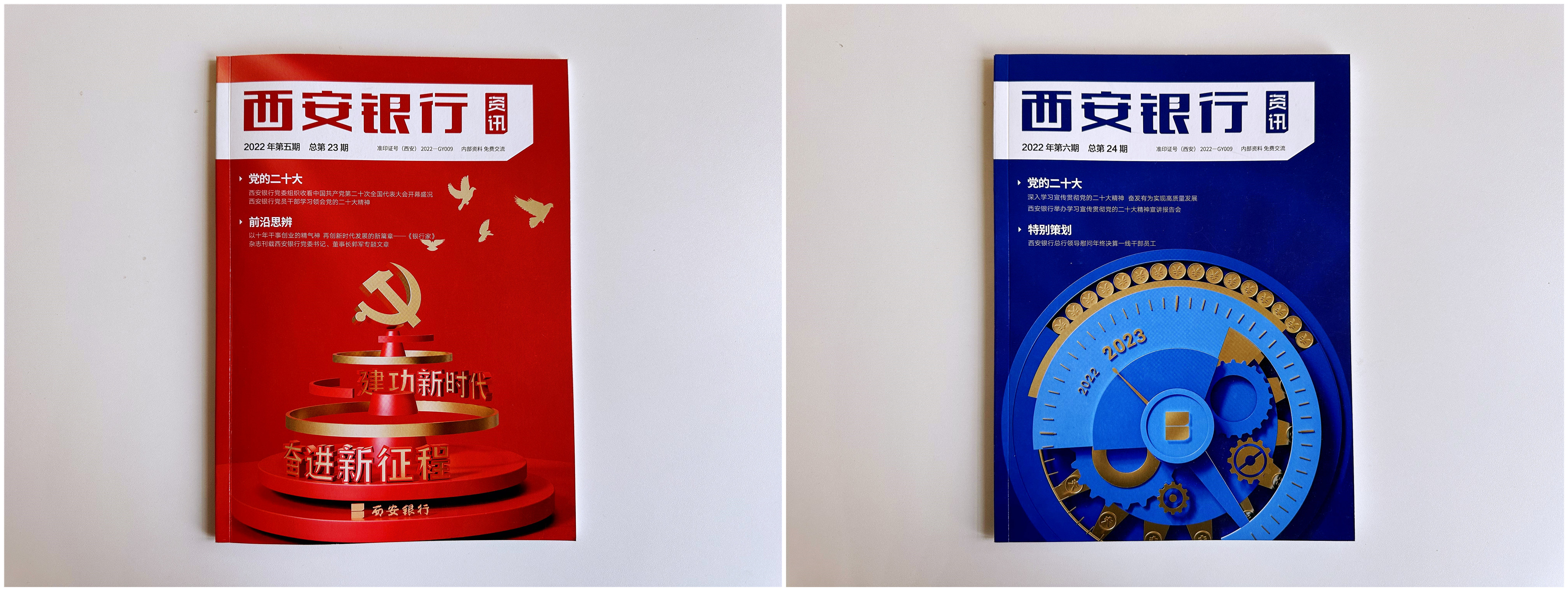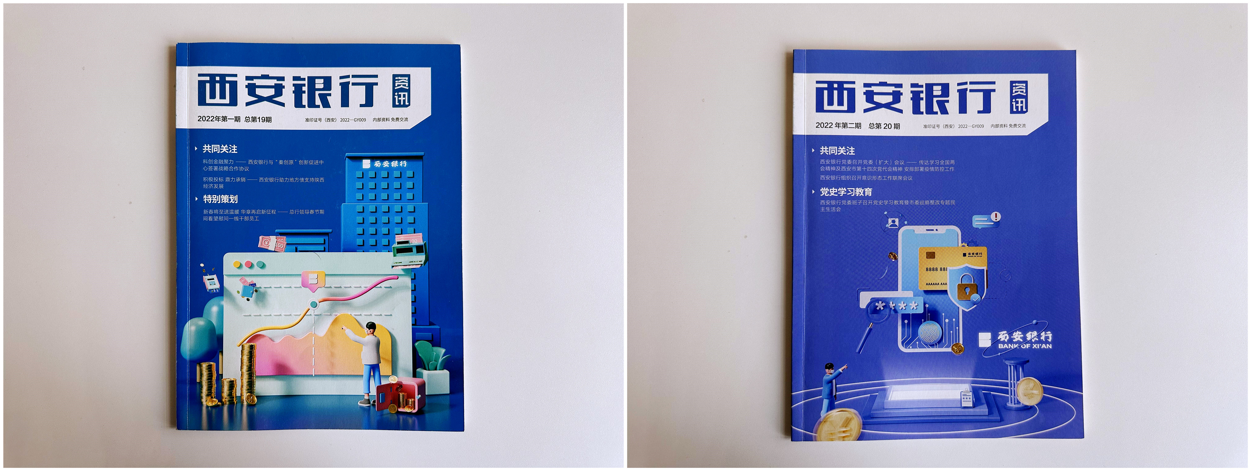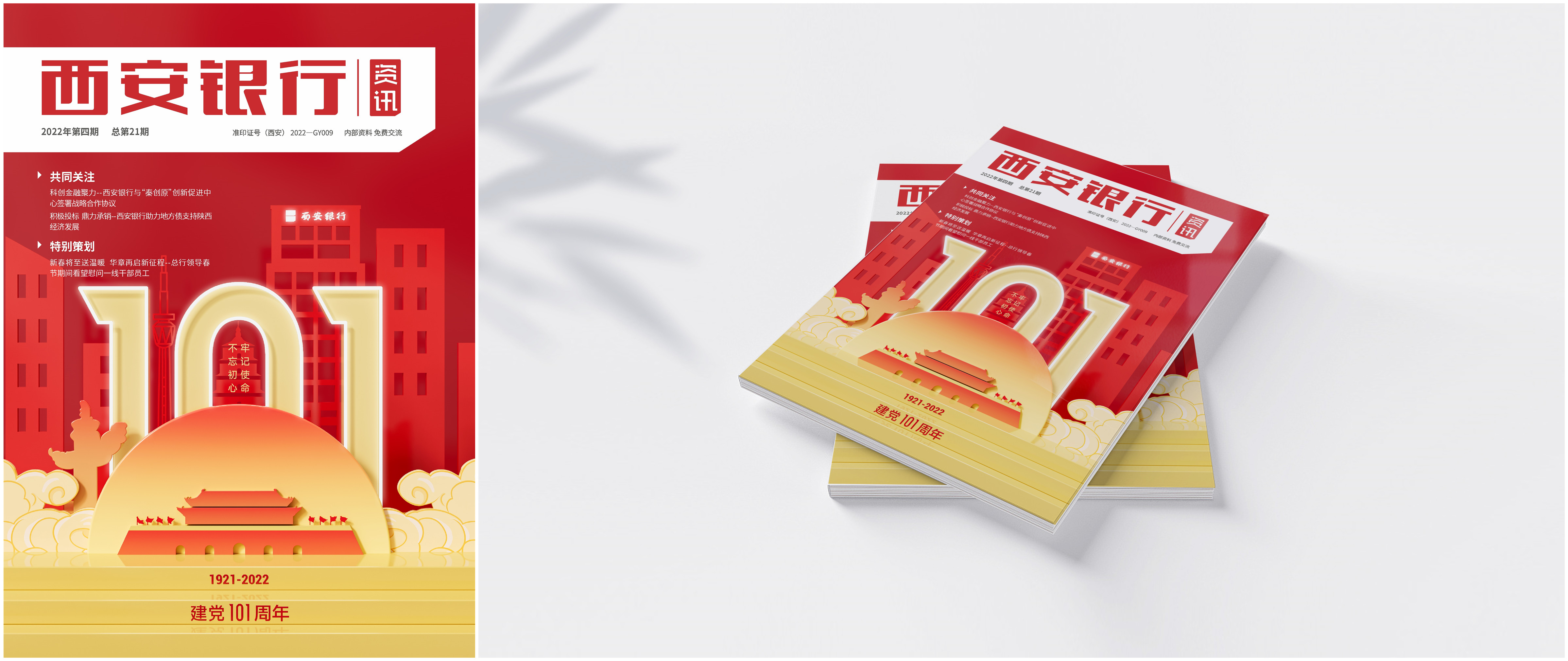 2022年《西安銀行》的封面設(shè)計,金蘋果團隊更是打破傳統(tǒng)設(shè)計手法,每期均根據(jù)不同的主題內(nèi)容進行針對性原創(chuàng)設(shè)計,以“三維建模及場景搭建”的全新設(shè)計筆觸,打造更加有質(zhì)感與亮眼的視覺效果。同時值得一提的是,2022年第三、四、五期期刊恰逢建黨節(jié)、西安銀行25周年及黨的二十大期間,特殊節(jié)點對封面色彩的應(yīng)用提出了更具象化的要求,“紅色”基本成為了核心色調(diào),但色彩的框定并未局限設(shè)計的廣度,多維設(shè)計形式與時事結(jié)合,“似而不同”的設(shè)計效果反而更容易激發(fā)讀者的大腦活性區(qū)域,由此也大幅提升了閱覽的期待值與積極性!