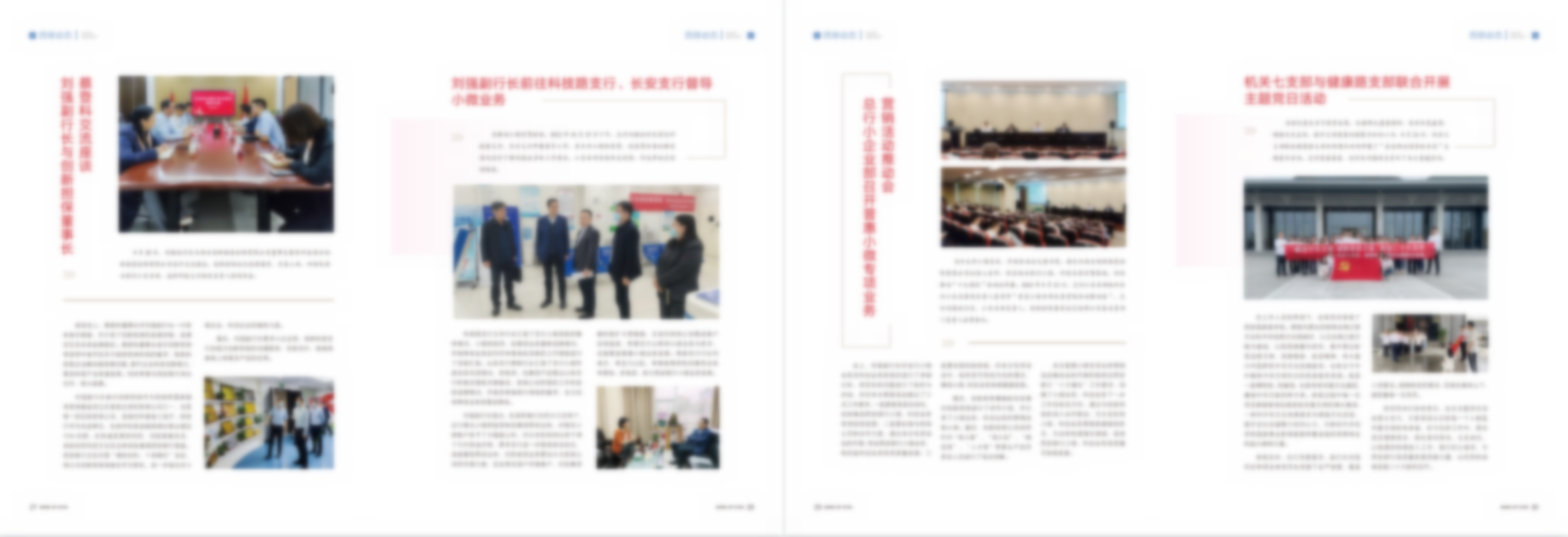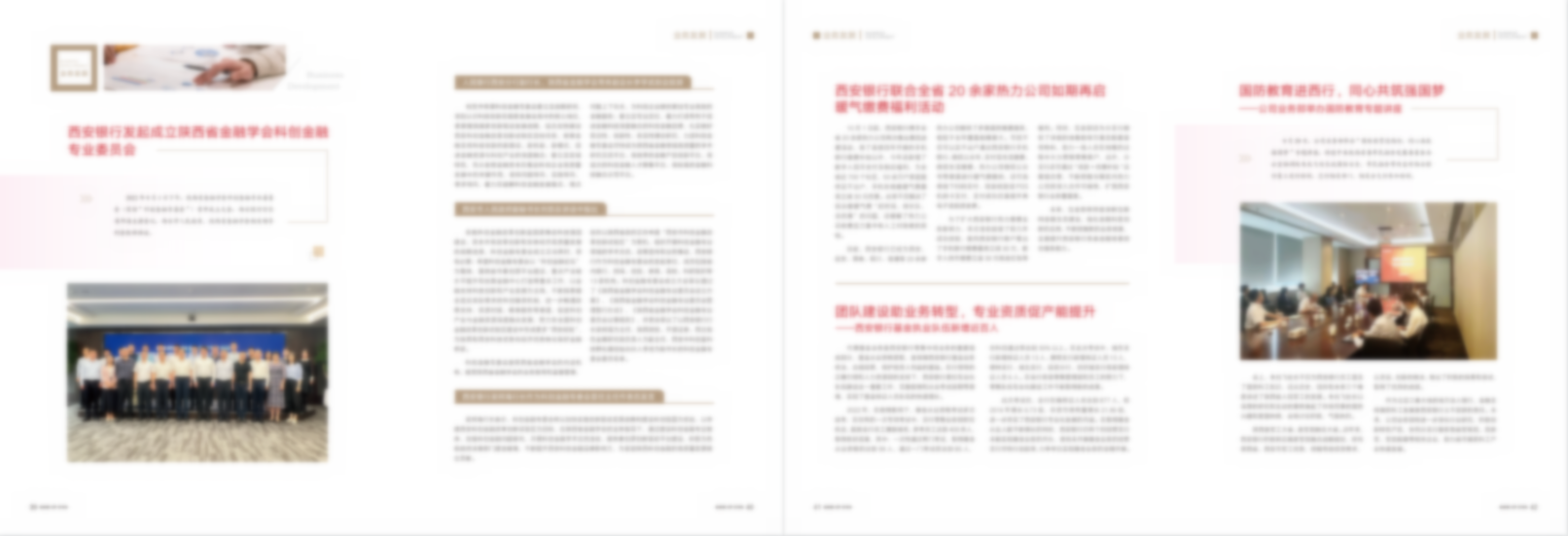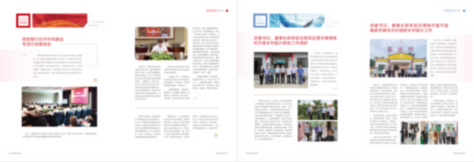 在2022年《西安銀行》期刊內(nèi)刊的排版設(shè)計中,設(shè)計師從期刊的目錄到各版塊的標頭、頁腳頁眉等處均精細設(shè)計,采用不同的色彩以及圖片切割嵌入等方式,從而在不失整體排版風格的前提下,做到清晰的版塊劃分與內(nèi)容方向引導(dǎo)區(qū)分,由此幫助讀者快速識別版塊內(nèi)容,方便信息瀏覽,同時提升內(nèi)刊的視覺效果。