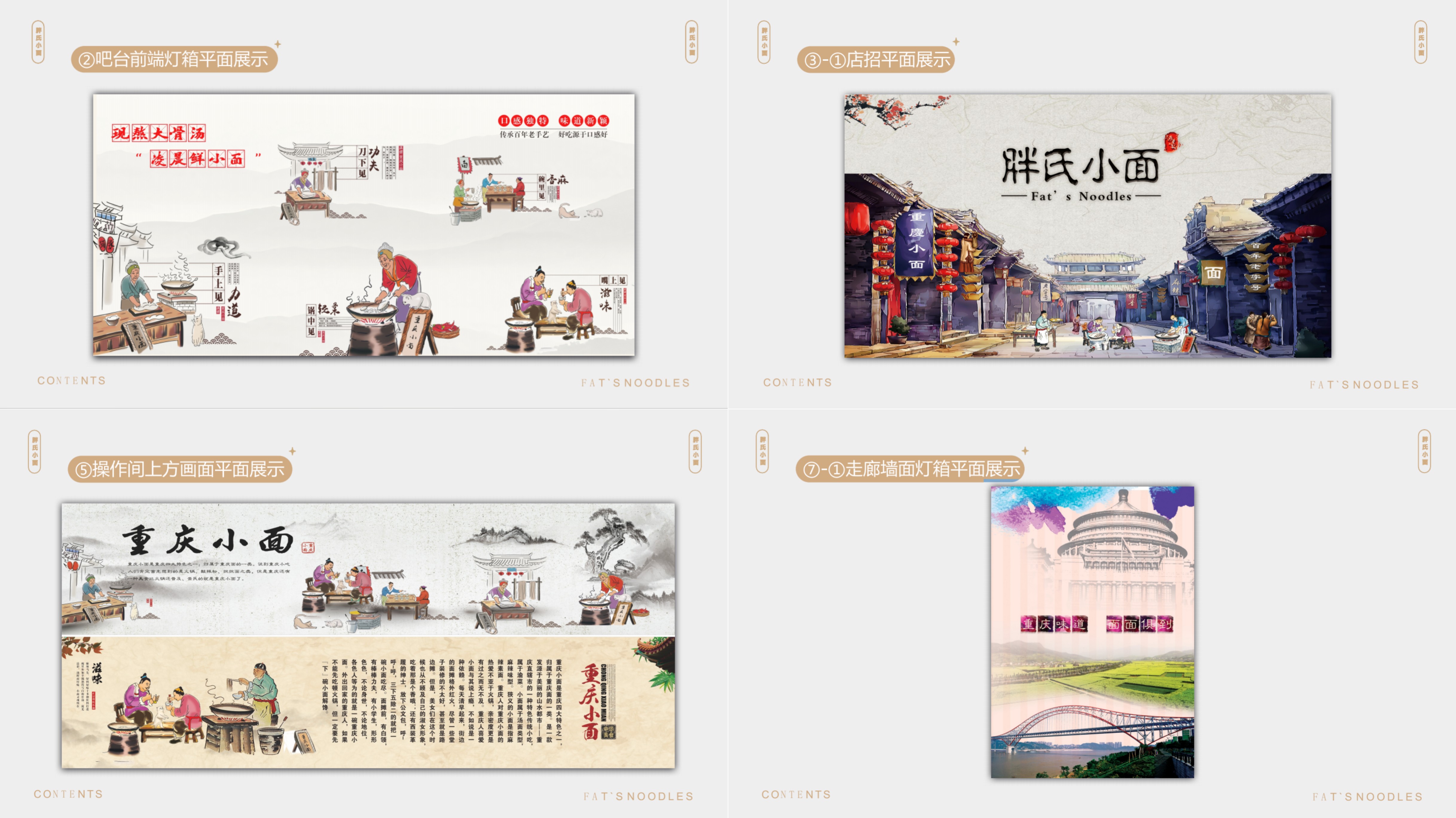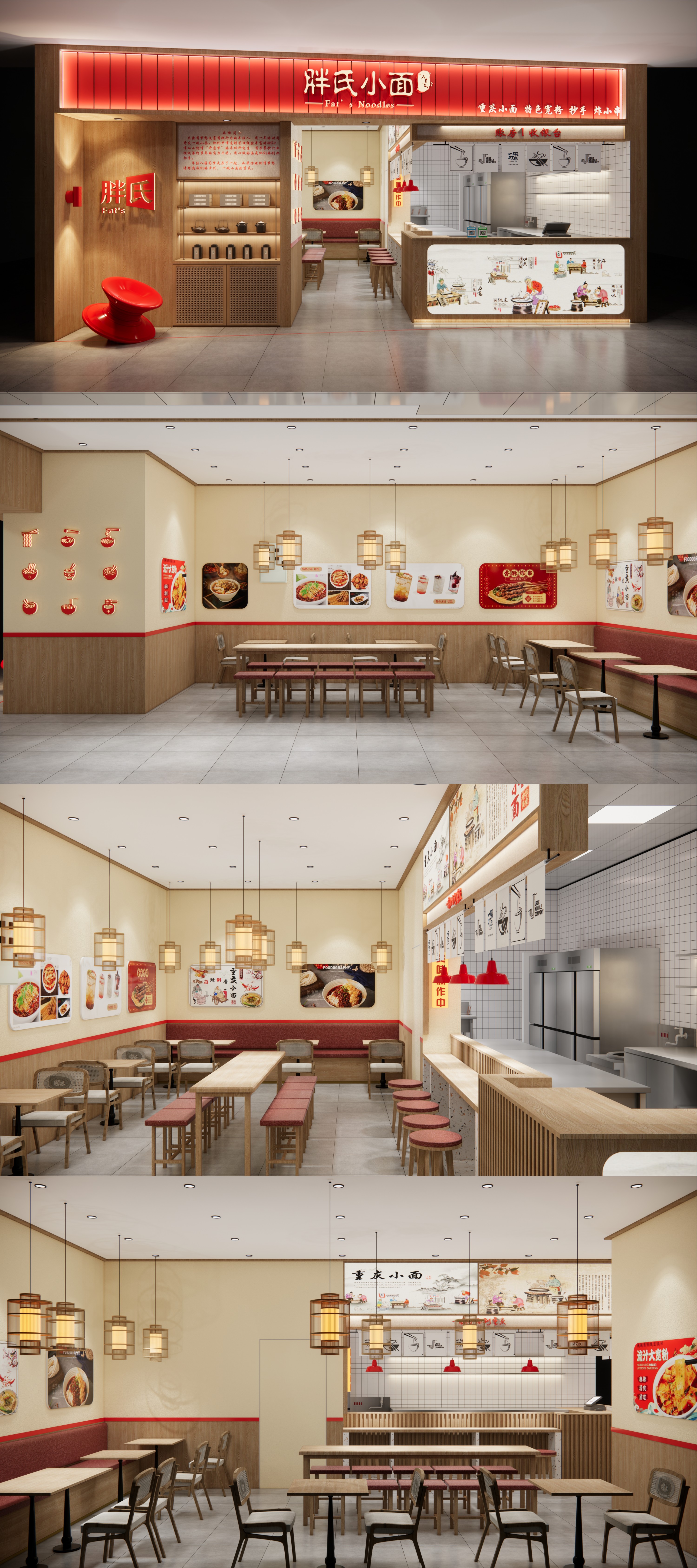 基于對“胖氏”美食文化及現(xiàn)場環(huán)境的了解,設(shè)計團(tuán)隊(duì)從整體配色、輔助燈光、燈箱畫面、桌椅配置等角度進(jìn)行匹配,以打造溫馨舒適的就餐環(huán)境為主旨,既不打破與周邊環(huán)境及店鋪的和諧度,又保證存在獨(dú)樹一幟的吸睛度 ,從而讓“胖氏小面”脫穎而出,成為一眾店面的“門面擔(dān)當(dāng)”,同時,在店內(nèi)的裝飾畫面的設(shè)計上,除調(diào)動食欲外,進(jìn)一步向顧客展示小面烹飪文化,讓“胖氏小面”既是文化的受益者,更成為文化的傳播者。整體設(shè)計風(fēng)格及設(shè)計思路經(jīng)過仔細(xì)打磨調(diào)整,斬獲客戶高度贊揚(yáng)。