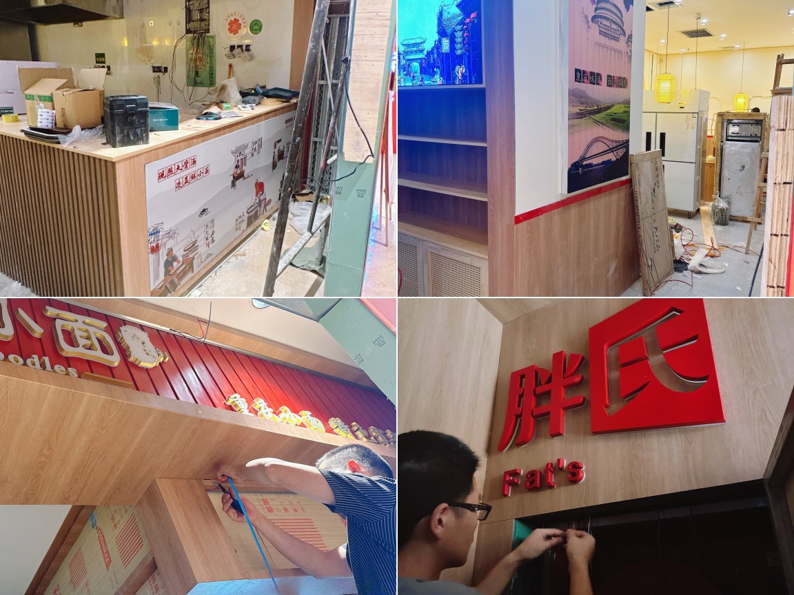 好的設(shè)計自然也需要好的施工來兌現(xiàn),在后期的實(shí)際裝修過程中,Goappe團(tuán)隊(duì)選用有著豐富裝修經(jīng)驗(yàn)的工人團(tuán)隊(duì),進(jìn)行精細(xì)施工,為保證最終設(shè)計作品的還原度,項(xiàng)目負(fù)責(zé)人及設(shè)計人員也多次親臨監(jiān)工完整裝修過程,以此確保成品的質(zhì)量及設(shè)計細(xì)節(jié)的完整度。經(jīng)不懈努力,最終裝修高效完成,“胖氏小面”也如期開業(yè),往來顧客絡(luò)繹不絕,好評如潮!