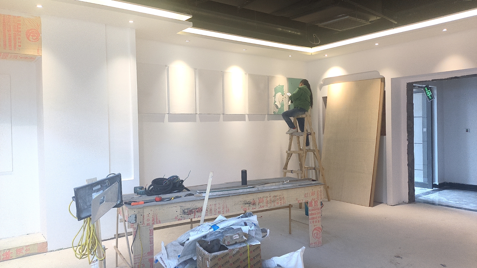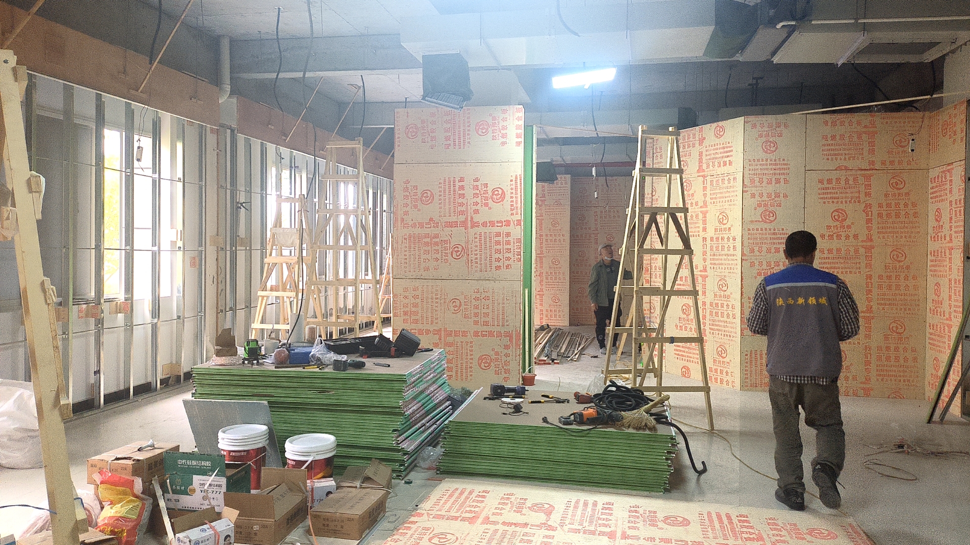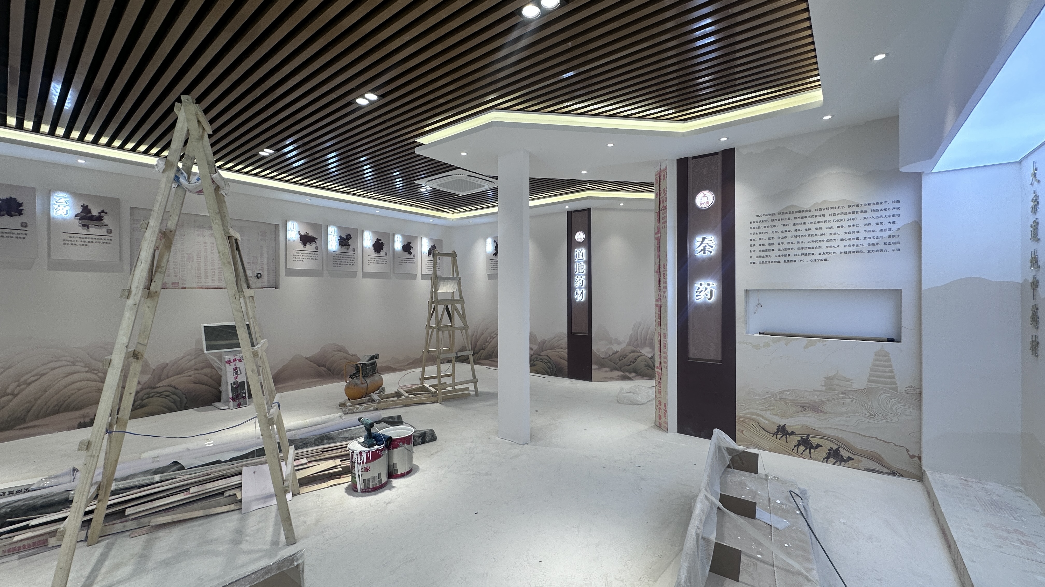 施工作業(yè),是一場“腦”與“力”并肩作戰(zhàn)的過程,它大到一些超重材料的組裝搭建,細到毫厘間的尺寸銜接和角度調(diào)控。在中藥標本館的施工初期,項目團隊依據(jù)施工方案及設(shè)計方案,利用高質(zhì)量輕鋼龍骨做好墻面骨架,用隔音棉填充后再用石膏板封平,并加以鋁塑板、碳晶板、免漆板等板材貼面,后期飾面則采用高光領(lǐng)面烤漆等,由此完成展館的基礎(chǔ)架構(gòu)。后續(xù)依據(jù)展館設(shè)計及展示需求,充分完善電路預埋、設(shè)備安裝、廣告安裝、展柜入場等工序,妥善處理好各步驟施工作業(yè)。