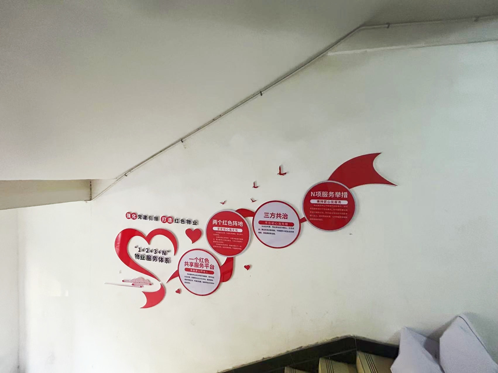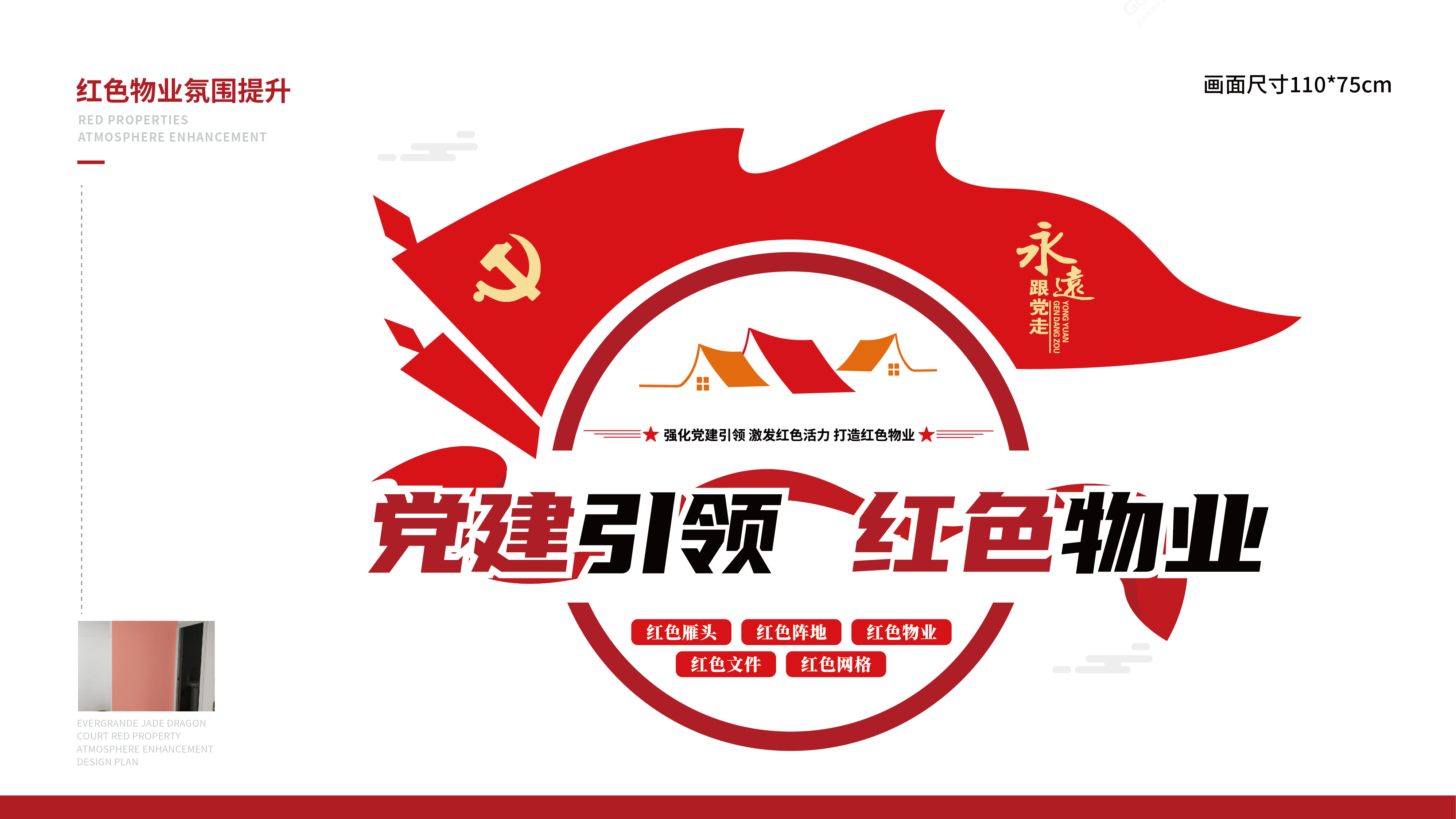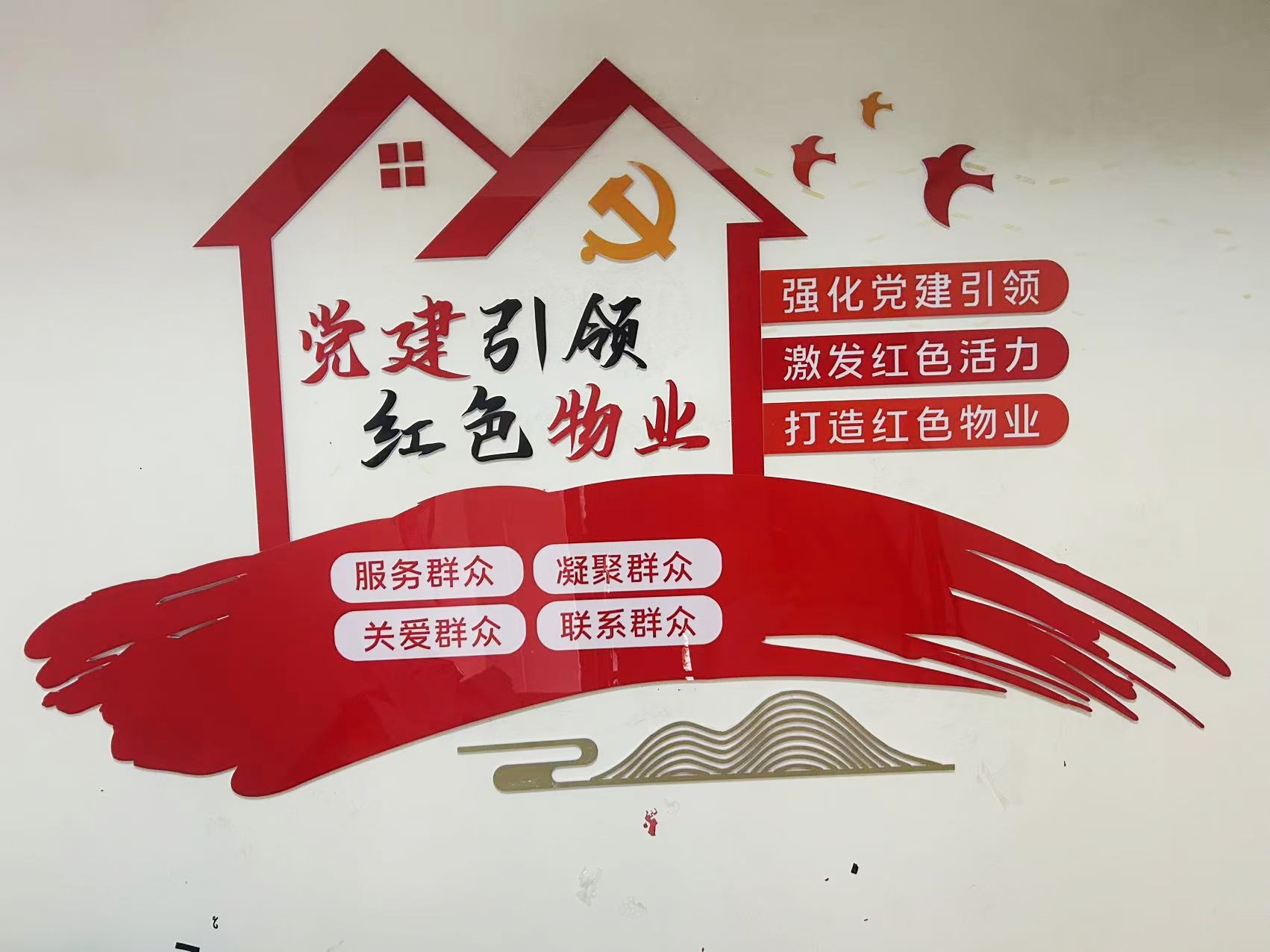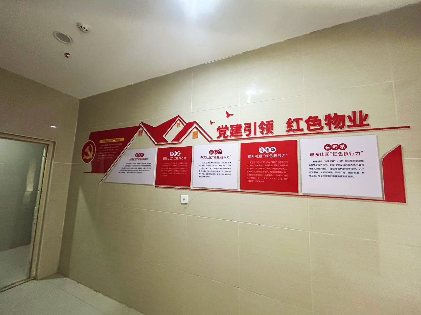紅色物業(yè)建設(shè),作為黨建文化的重要展示窗口,在社區(qū)工作及群眾精神凝聚上起著重要的作用。項(xiàng)目組因地制宜,實(shí)地走訪社區(qū)環(huán)境,擇選適宜建設(shè)與營(yíng)造的最佳點(diǎn)位,根據(jù)設(shè)計(jì)圖紙進(jìn)行1:1還原上墻,通過(guò)完整的系列氛圍搭建,將“紅色物業(yè)”建設(shè)的理念兌現(xiàn)于社區(qū)真實(shí)空間環(huán)境。