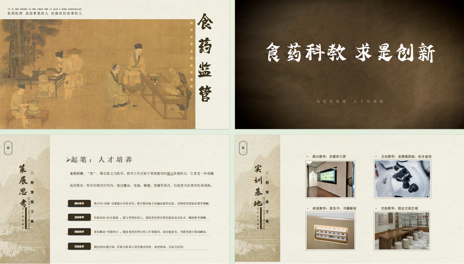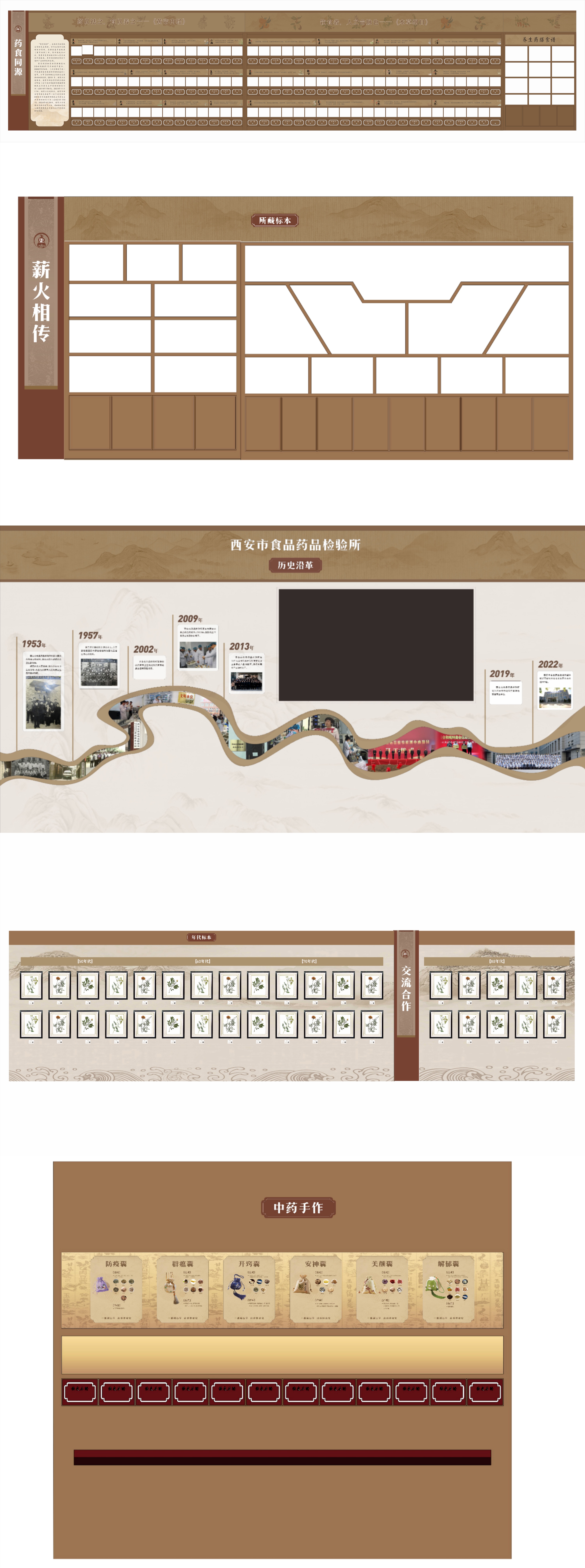 項(xiàng)目二期作為一期空間意義上的延續(xù),在整體的視覺效果上需保持統(tǒng)一,但具體的展示創(chuàng)意大相徑庭;在展示內(nèi)容上圍繞策劃總邏輯“起筆中藥根基 落筆百姓民生”的核心概念,在已有的中藥文化的展示基礎(chǔ)上,深度鏈接與民生息息相關(guān)的“藥食同源”概念,同步銜接食藥監(jiān)所幾十余年的傳承與守護(hù),加之展示與互動(dòng)功能輔助,使展館在整體邏輯敘述上形成閉環(huán)。