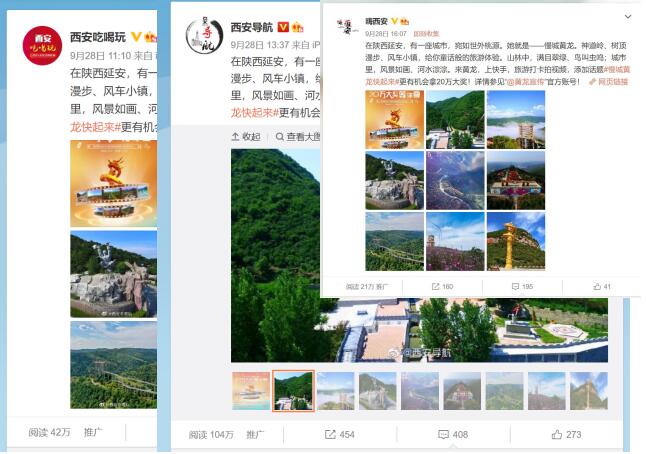 還有廣播廣告、地鐵語音廣告以及線上投放微信公眾號軟文、微博大V推文等新媒體宣傳稿件,有效地將黃龍旅游品牌形象和短視頻挑戰(zhàn)賽活動信息傳遞給有車族、上班族等群體,覆蓋陜西省內(nèi)主要目標受眾達800萬之多。