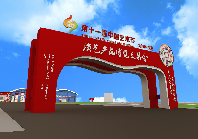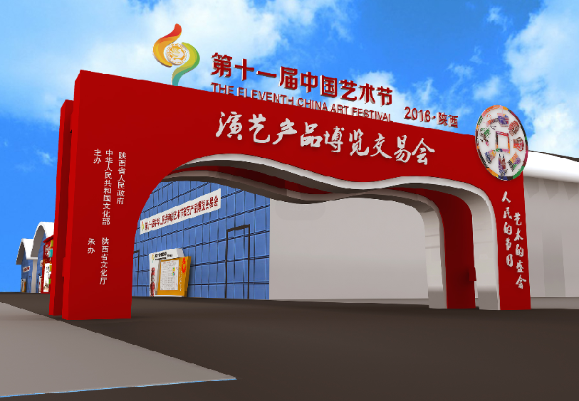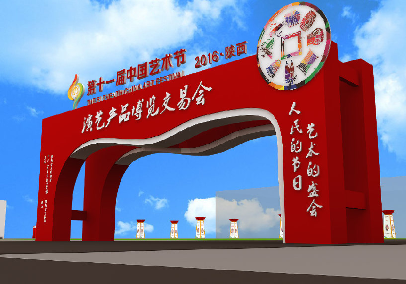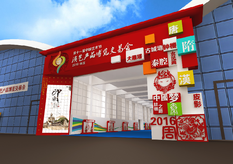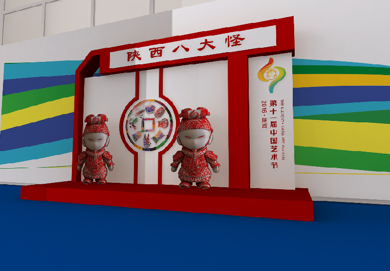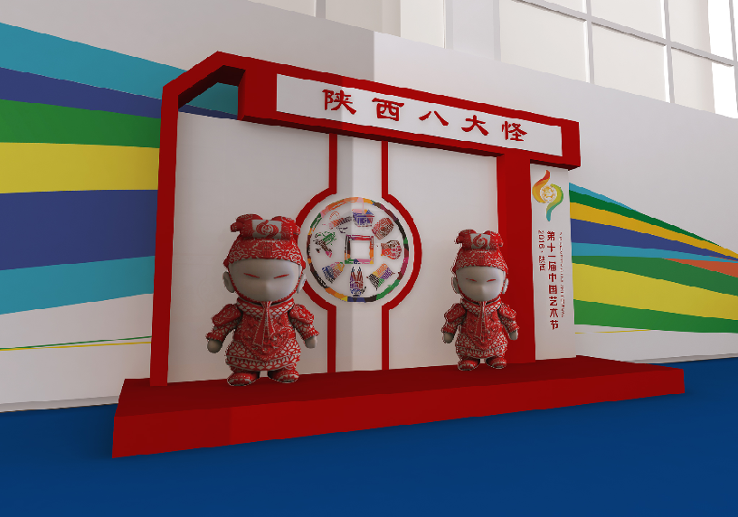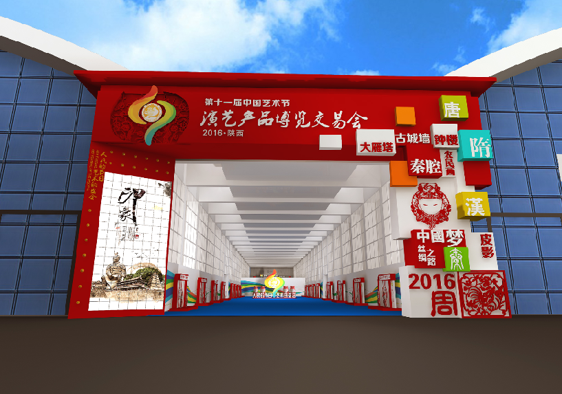 B2-B3會場的連廊拱門,一側(cè)用圖文錯落的形式展現(xiàn),突出陜西的地緣性,融入中國的大背景,富有藝術(shù) 感。拱門左側(cè)用一扇古代大門樣式展現(xiàn),中間設(shè)置了LED大屏,動態(tài)展現(xiàn)十一藝節(jié)相關(guān)畫面,整體動靜結(jié)合,立體感十足。 陜西特色展臺設(shè)計上以十一藝節(jié)標(biāo)志“中和”為創(chuàng)意基礎(chǔ),融入演交會海報標(biāo)識,并結(jié)合秦親寶貝造型, 形成簡約大氣的展臺造型。同時,區(qū)域中間搭建了十一藝節(jié)標(biāo)志展臺,并有四個威武的“秦親寶貝”護(hù)航,并融入 “人民的節(jié)日,藝術(shù)的盛會”口號宣傳。進(jìn)入開幕式舞臺會場,古典的卷軸造型大氣又散發(fā)著藝術(shù)氣息,使整個舞臺背景更富畫面感,十分貼切此次盛事的格調(diào)。