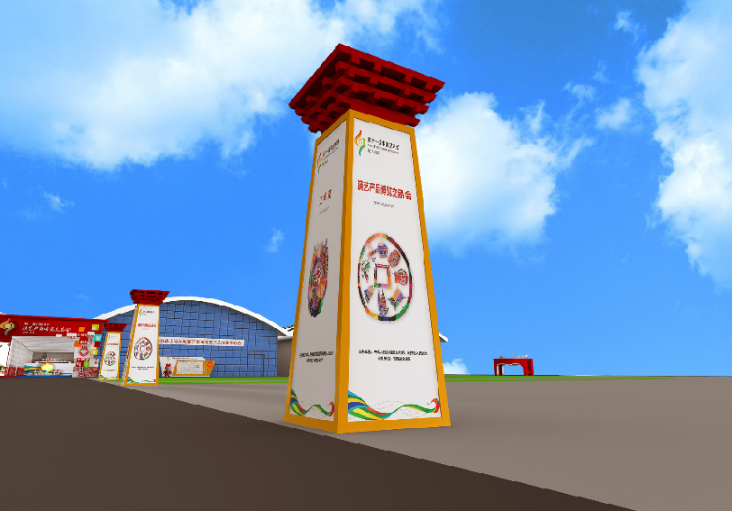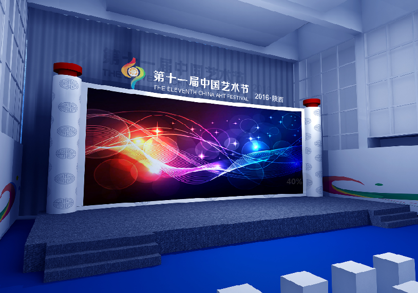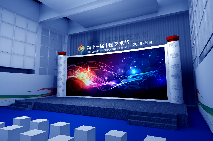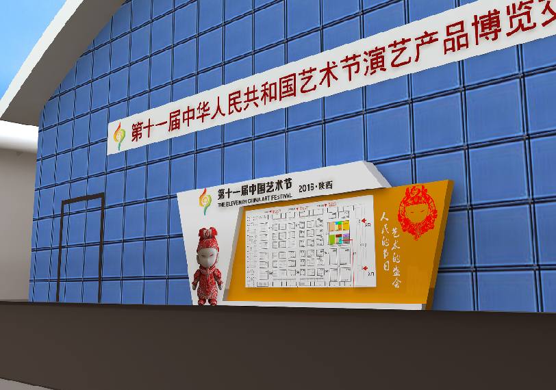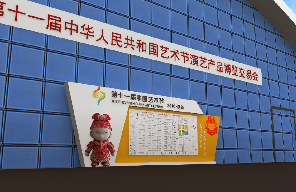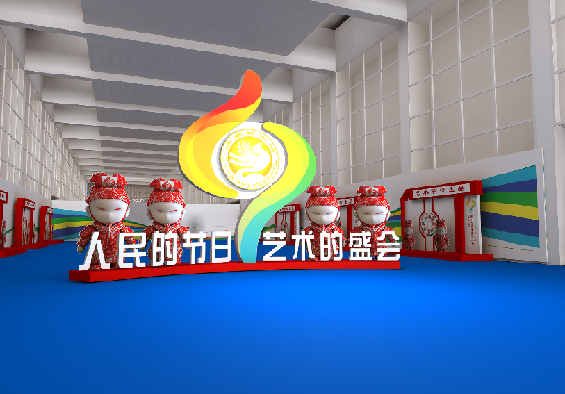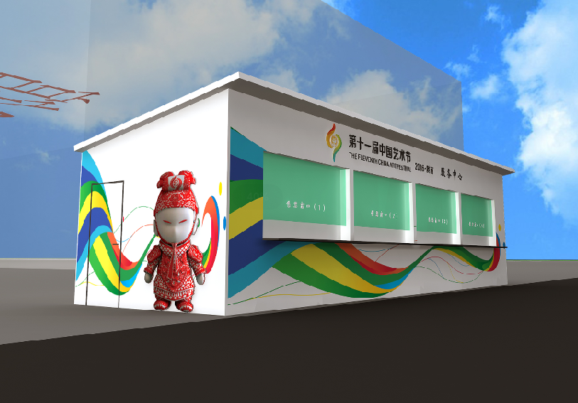B2-B3會場的連廊拱門,一側(cè)用圖文錯落的形式展現(xiàn),突出陜西的地緣性,融入中國的大背景,富有藝術(shù) 感。拱門左側(cè)用一扇古代大門樣式展現(xiàn),中間設(shè)置了LED大屏,動態(tài)展現(xiàn)十一藝節(jié)相關(guān)畫面,整體動靜結(jié)合,立體感十足。 陜西特色展臺設(shè)計上以十一藝節(jié)標(biāo)志“中和”為創(chuàng)意基礎(chǔ),融入演交會海報標(biāo)識,并結(jié)合秦親寶貝造型, 形成簡約大氣的展臺造型。同時,區(qū)域中間搭建了十一藝節(jié)標(biāo)志展臺,并有四個威武的“秦親寶貝”護(hù)航,并融入 “人民的節(jié)日,藝術(shù)的盛會”口號宣傳。進(jìn)入開幕式舞臺會場,古典的卷軸造型大氣又散發(fā)著藝術(shù)氣息,使整個舞臺背景更富畫面感,十分貼切此次盛事的格調(diào)。
