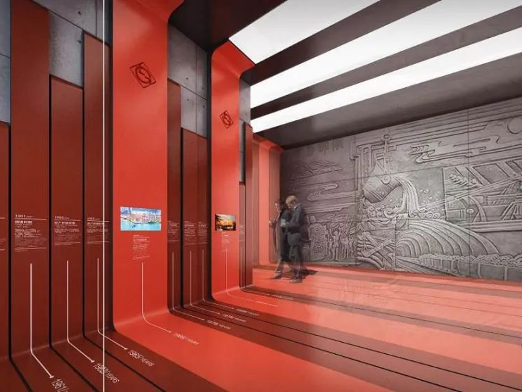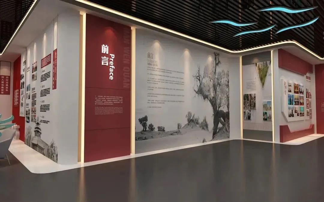 設(shè)計(jì)思路:采用美觀的設(shè)計(jì)元素、合理的空間布局、引人注目的視覺效果,以增加吸引力。除了紅色的元素以外,可以運(yùn)用一些其他的元素,如山水畫、中國風(fēng)、古代建筑形式等,融入到整個(gè)展廳的色系中。