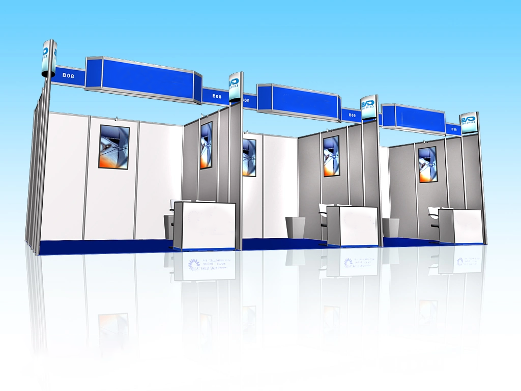 標(biāo)準(zhǔn)展位一般情況下整體框架由展會(huì)主/承辦方負(fù)責(zé)搭建,參展商可以自行設(shè)計(jì)宣傳畫面張貼在各自展位中,輔助展示說明。