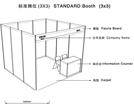 在標(biāo)準(zhǔn)展位正向上部提供寫有中英文參展商名稱和展位號(hào)的楣板,楣板高度一般為20cm;位于拐角處的標(biāo)準(zhǔn)展位,默認(rèn)去掉通道一側(cè)的墻板,增加一面楣板。同意參展商的兩個(gè)或多個(gè)相鄰標(biāo)準(zhǔn)展位,默認(rèn)去掉中間的墻隔板。